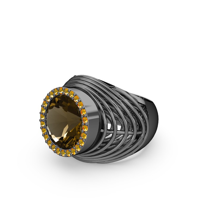 Dumanlı kuvars ve sitrin 925 ayar siyah rodyum kaplama gümüş yüzük