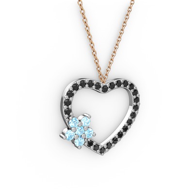 Akuamarin ve siyah zirkon 925 ayar gümüş kolye (40 cm rose altın rolo zincir)
