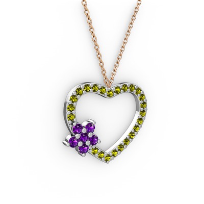 Ametist ve peridot 925 ayar gümüş kolye (40 cm rose altın rolo zincir)