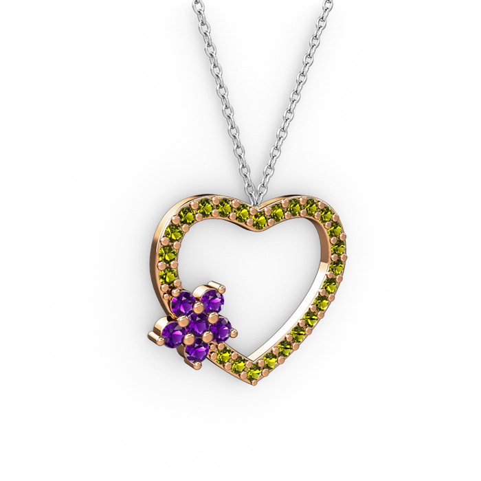 Ametist ve peridot 925 ayar rose altın kaplama gümüş kolye (40 cm beyaz altın rolo zincir)