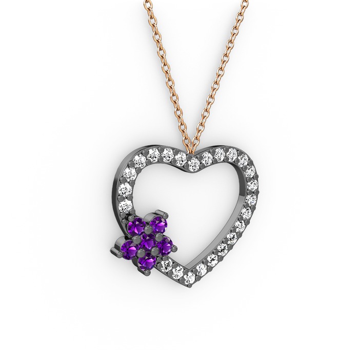 Ametist ve pırlanta 925 ayar siyah rodyum kaplama gümüş kolye (0.36 karat, 40 cm rose altın rolo zincir)