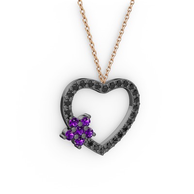 Ametist ve siyah zirkon 925 ayar siyah rodyum kaplama gümüş kolye (40 cm rose altın rolo zincir)