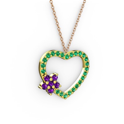 Ametist ve yeşil kuvars 18 ayar altın kolye (40 cm rose altın rolo zincir)