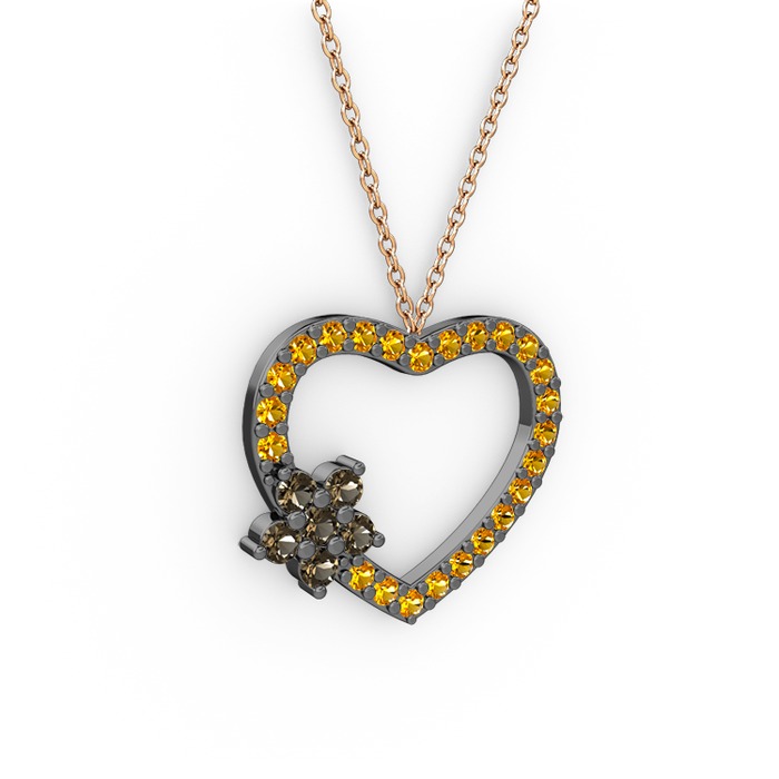 Dumanlı kuvars ve sitrin 925 ayar siyah rodyum kaplama gümüş kolye (40 cm rose altın rolo zincir)