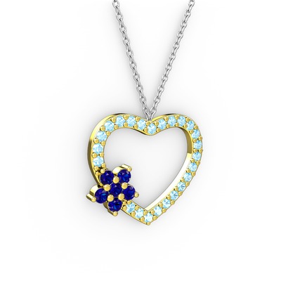 Lab safir ve akuamarin 925 ayar altın kaplama gümüş kolye (40 cm beyaz altın rolo zincir)