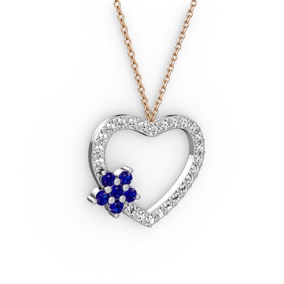 Lab safir ve beyaz zirkon 14 ayar beyaz altın kolye (40 cm gümüş rolo zincir)