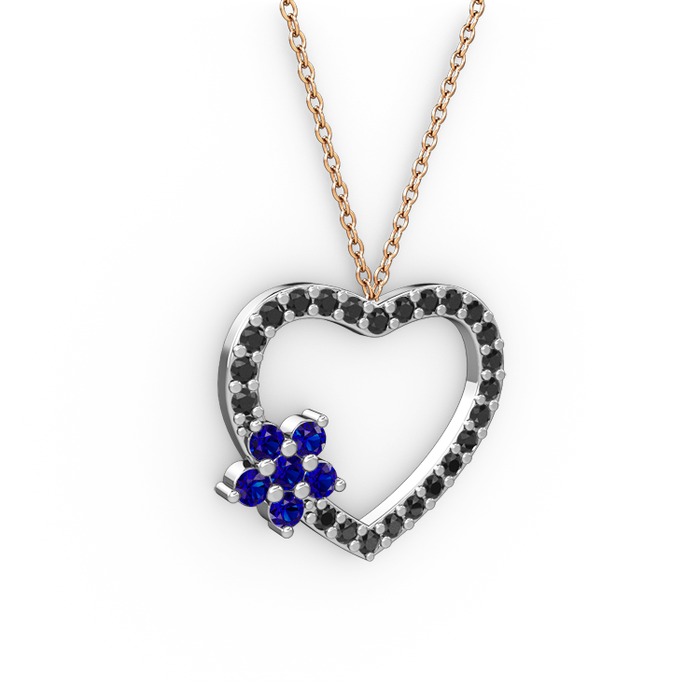 Lab safir ve siyah zirkon 14 ayar beyaz altın kolye (40 cm rose altın rolo zincir)
