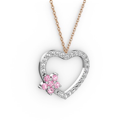 Pembe kuvars ve beyaz zirkon 14 ayar beyaz altın kolye (40 cm rose altın rolo zincir)
