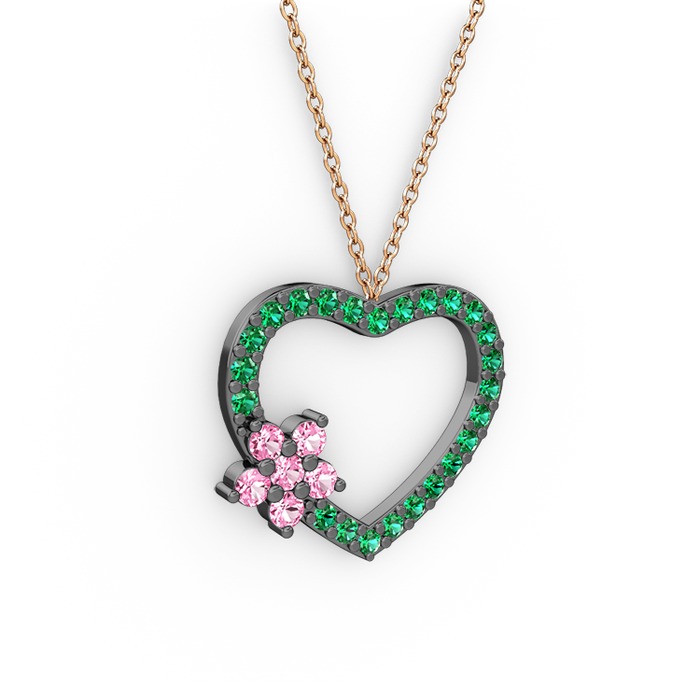 Pembe kuvars ve yeşil kuvars 925 ayar siyah rodyum kaplama gümüş kolye (40 cm rose altın rolo zincir)