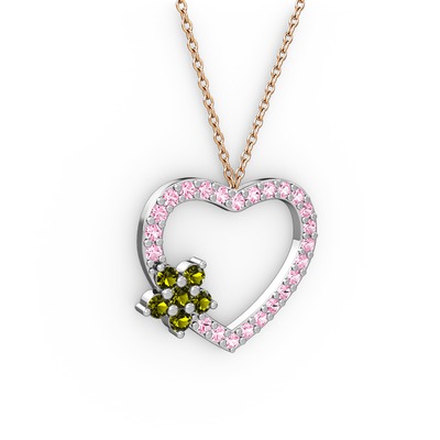 Peridot ve pembe kuvars 14 ayar beyaz altın kolye (40 cm gümüş rolo zincir)