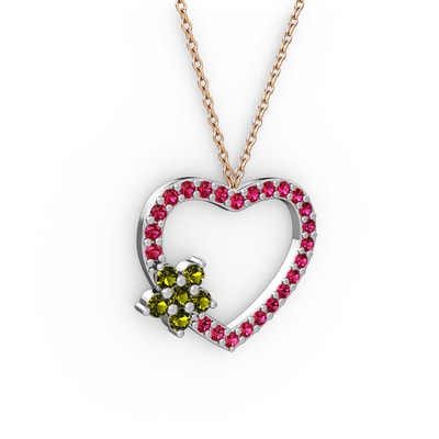 Peridot ve rodolit garnet 8 ayar beyaz altın kolye (40 cm rose altın rolo zincir)