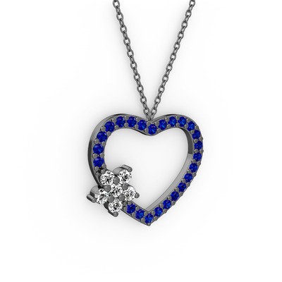 Pırlanta ve lab safir 925 ayar siyah rodyum kaplama gümüş kolye (0.216 karat, 40 cm gümüş rolo zincir)