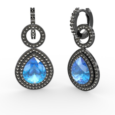 Akuamarin ve dumanlı kuvars 925 ayar siyah rodyum kaplama gümüş küpe