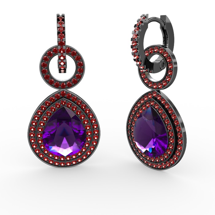 Ametist ve garnet 925 ayar siyah rodyum kaplama gümüş küpe