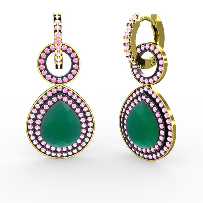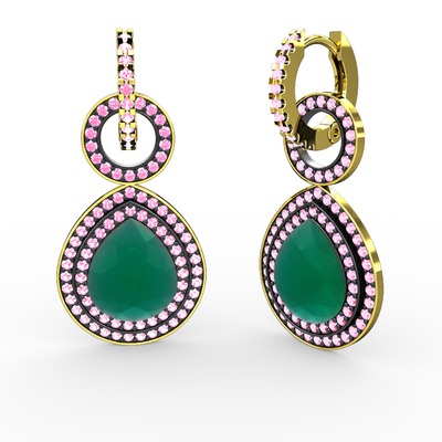 Kök zümrüt ve pembe kuvars 8 ayar altın küpe