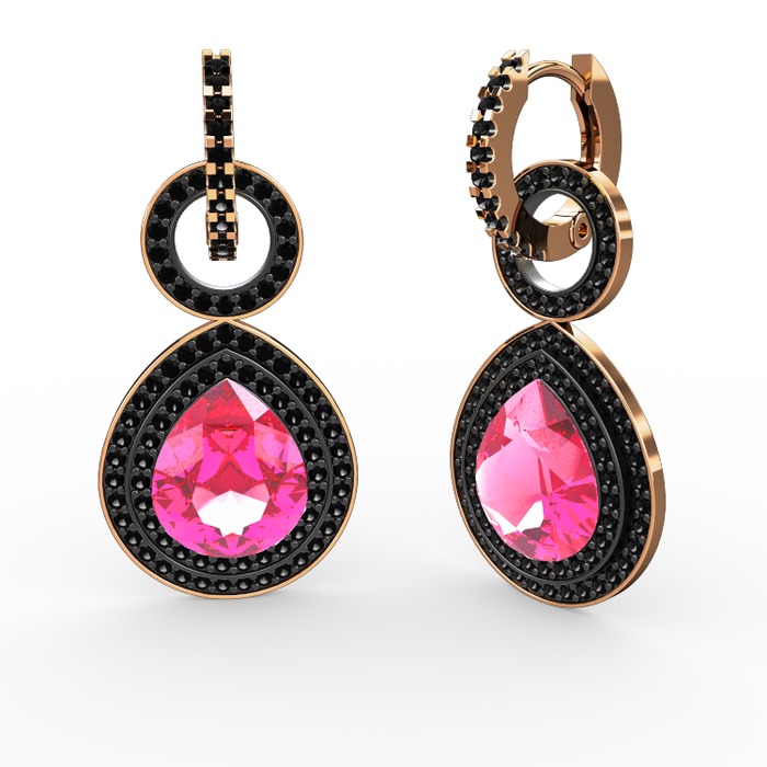 Pembe kuvars ve siyah zirkon 14 ayar rose altın küpe
