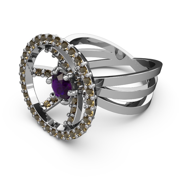 Dumanlı kuvars ve ametist 8 ayar beyaz altın yüzük