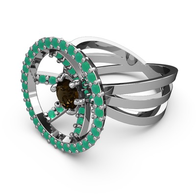 Kök zümrüt ve dumanlı kuvars 8 ayar beyaz altın yüzük