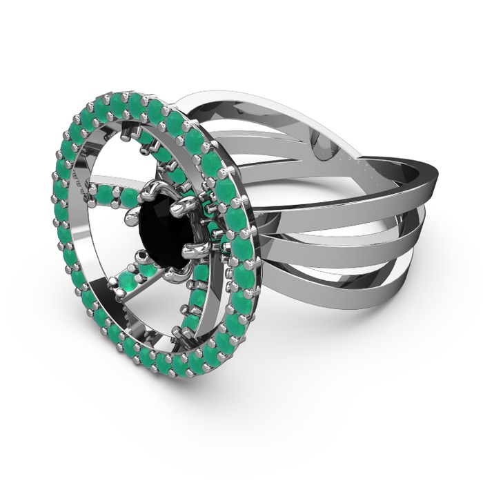 Kök zümrüt ve siyah zirkon 14 ayar beyaz altın yüzük