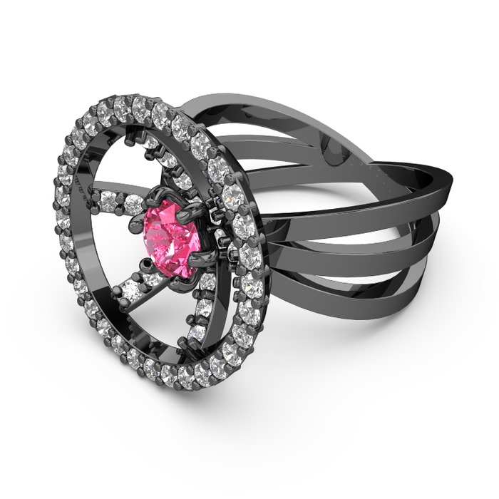 Swarovski ve pembe kuvars 925 ayar siyah rodyum kaplama gümüş yüzük