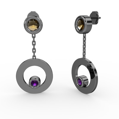 Dumanlı kuvars ve ametist 925 ayar siyah rodyum kaplama gümüş küpe