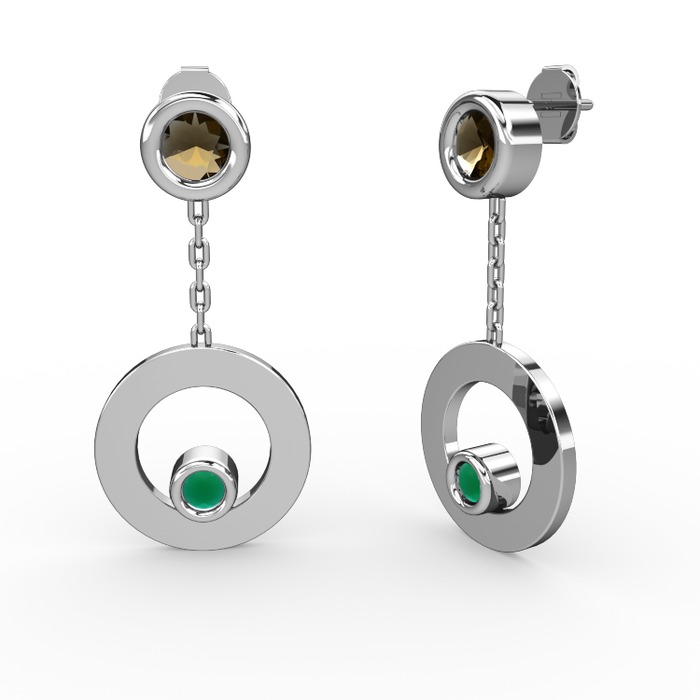 Dumanlı kuvars ve kök zümrüt 18 ayar beyaz altın küpe