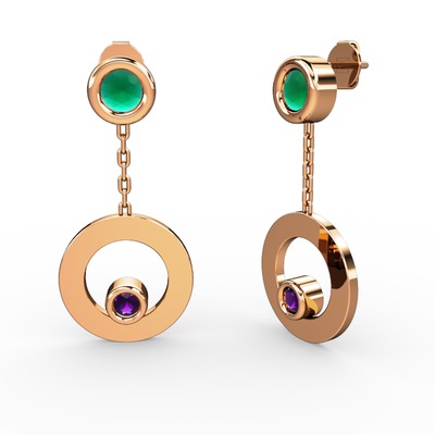 Kök zümrüt ve ametist 14 ayar rose altın küpe