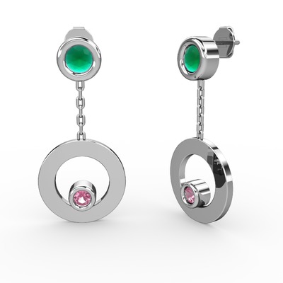 Kök zümrüt ve pembe kuvars 14 ayar beyaz altın küpe