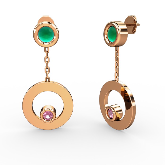 Kök zümrüt ve pembe kuvars 8 ayar rose altın küpe
