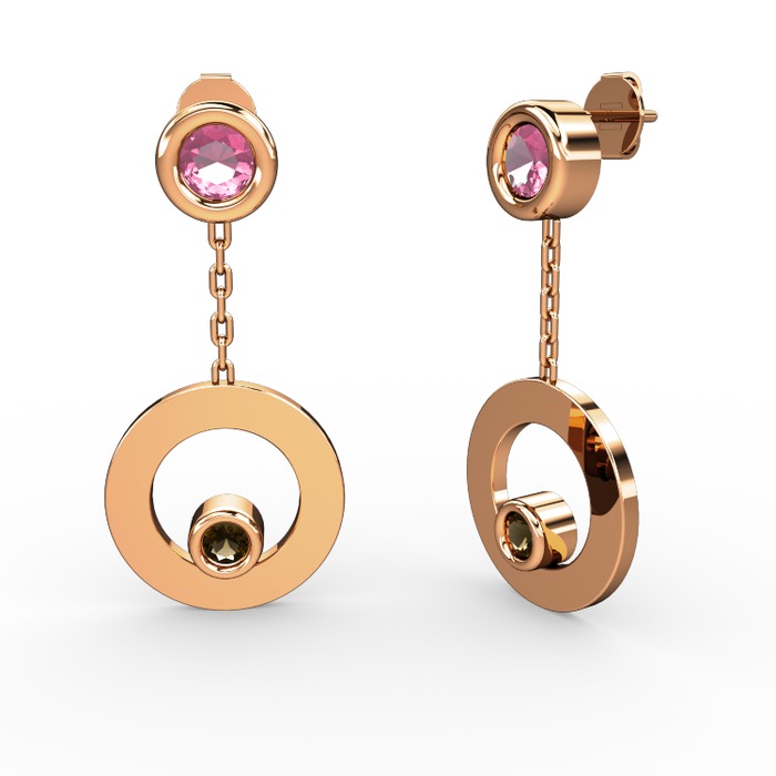 Pembe kuvars ve dumanlı kuvars 8 ayar rose altın küpe