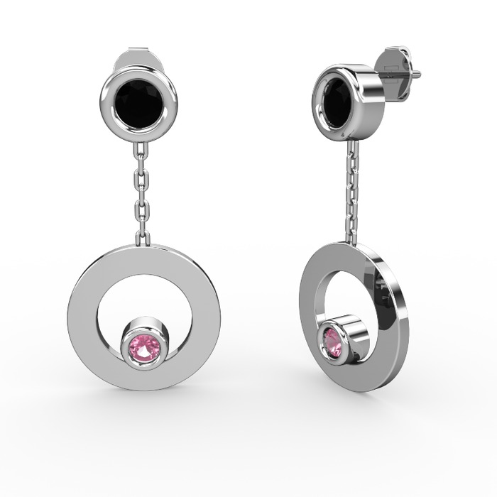 Siyah zirkon ve pembe kuvars 14 ayar beyaz altın küpe