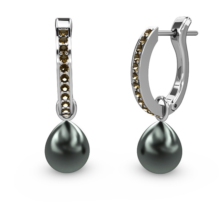 Dumanlı kuvars ve siyah inci 14 ayar beyaz altın küpe
