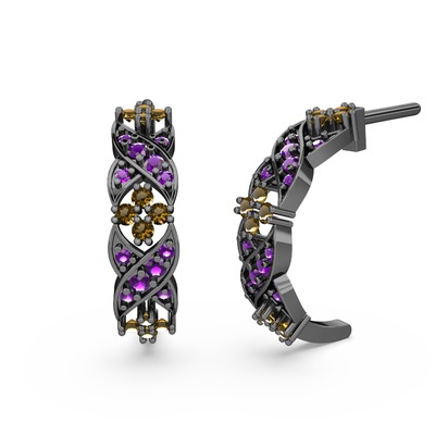 Ametist ve dumanlı kuvars 925 ayar siyah rodyum kaplama gümüş küpe
