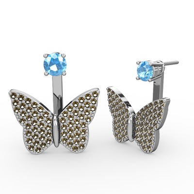Akuamarin ve dumanlı kuvars 8 ayar beyaz altın küpe