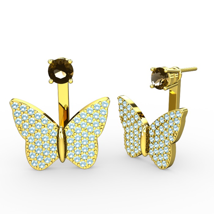 Dumanlı kuvars ve akuamarin 925 ayar altın kaplama gümüş küpe