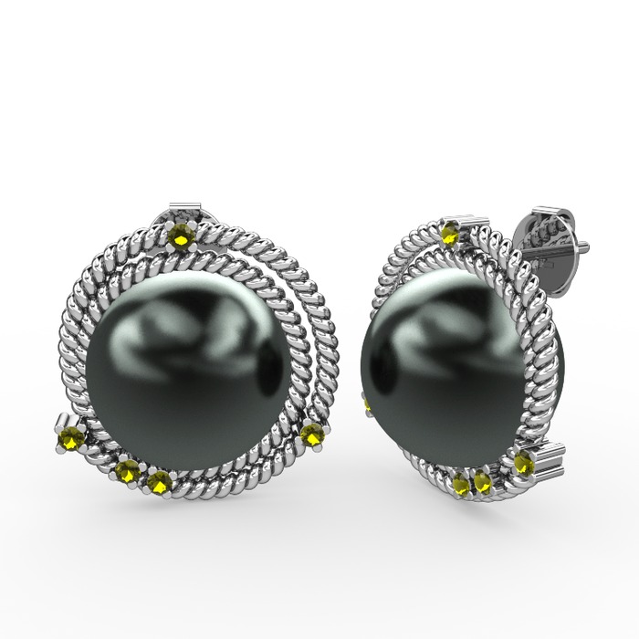 Siyah inci ve peridot 8 ayar beyaz altın küpe