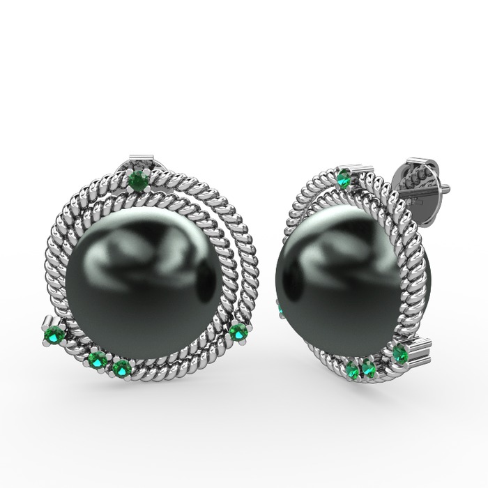 Siyah inci ve yeşil kuvars 14 ayar beyaz altın küpe