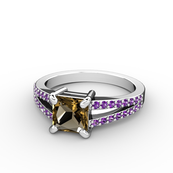 Dumanlı kuvars ve ametist 8 ayar beyaz altın yüzük