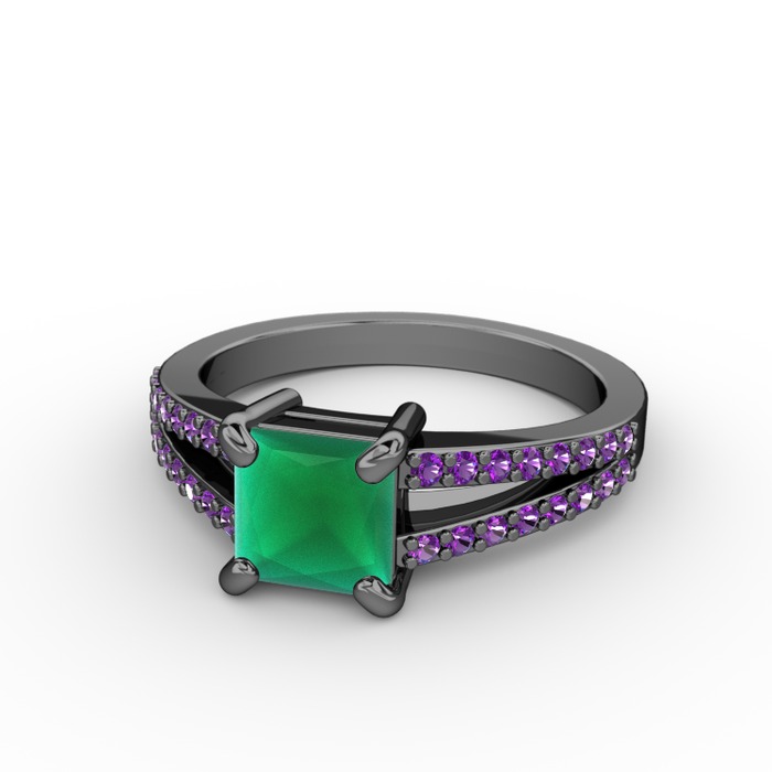 Kök zümrüt ve ametist 925 ayar siyah rodyum kaplama gümüş yüzük