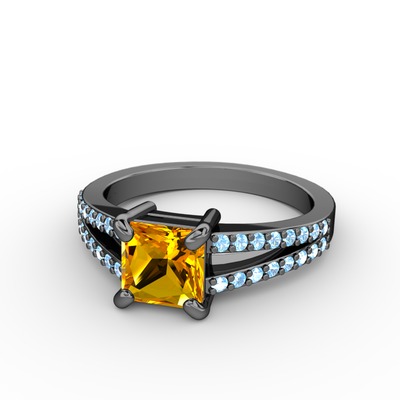 Sitrin ve akuamarin 925 ayar siyah rodyum kaplama gümüş yüzük