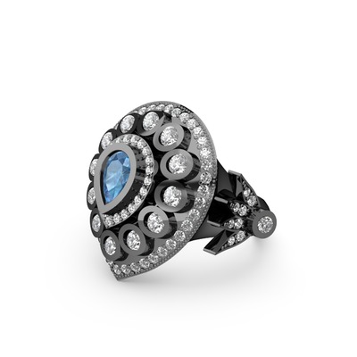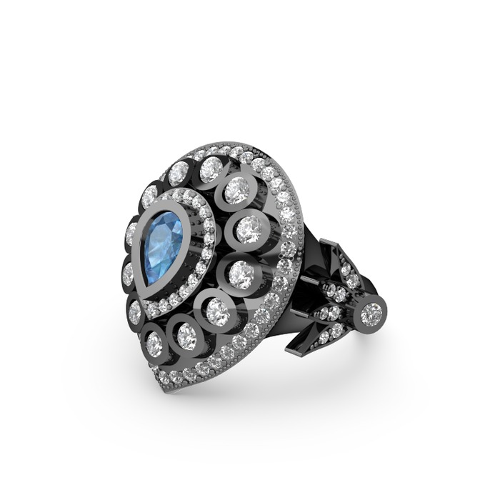 Akuamarin ve beyaz zirkon 925 ayar siyah rodyum kaplama gümüş yüzük