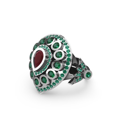 Kök yakut ve yeşil kuvars 14 ayar beyaz altın yüzük