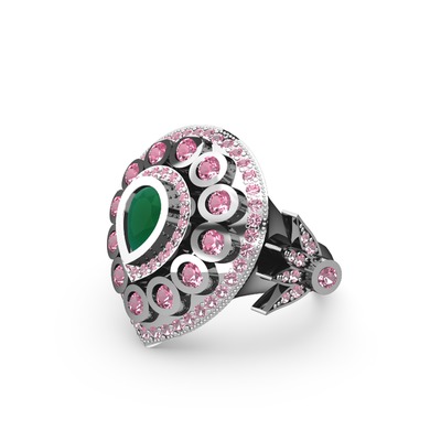 Kök zümrüt ve pembe kuvars 8 ayar beyaz altın yüzük