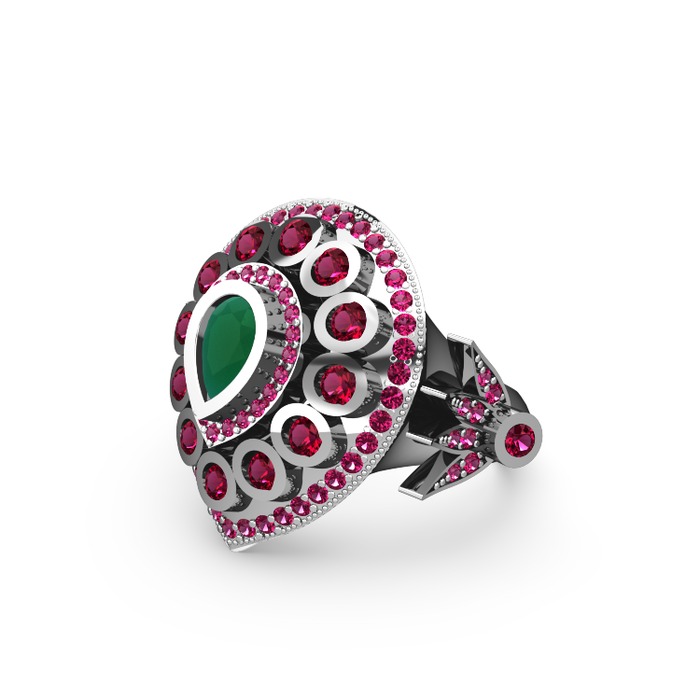 Kök zümrüt ve rodolit garnet 18 ayar beyaz altın yüzük