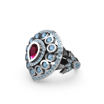 Rodolit garnet ve akuamarin 8 ayar beyaz altın yüzük