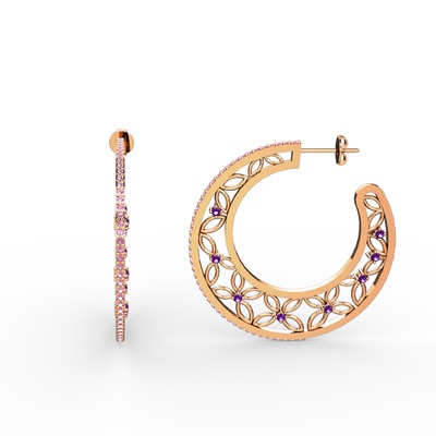 Pembe kuvars ve ametist 18 ayar rose altın küpe