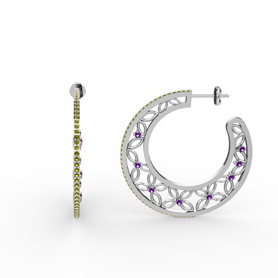 Peridot ve ametist 18 ayar beyaz altın küpe