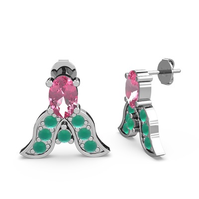 Pembe kuvars ve kök zümrüt 14 ayar beyaz altın küpe