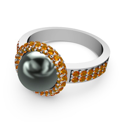 Sitrin ve siyah inci 14 ayar beyaz altın yüzük