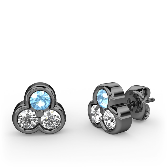 Akuamarin, beyaz zirkon ve swarovski 925 ayar siyah rodyum kaplama gümüş küpe